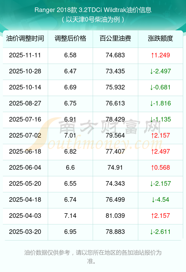 按11月11日0號柴油最新調整價格6.58元每升來計算(以天津為例),該車型百公里平均油費為74.683元,按上一輪10月28日調整價格6.47元每升來計算,百公里平均油費為73.435元,對比上一輪多花1.249元,下一輪油價調整時間為11月24日24時。