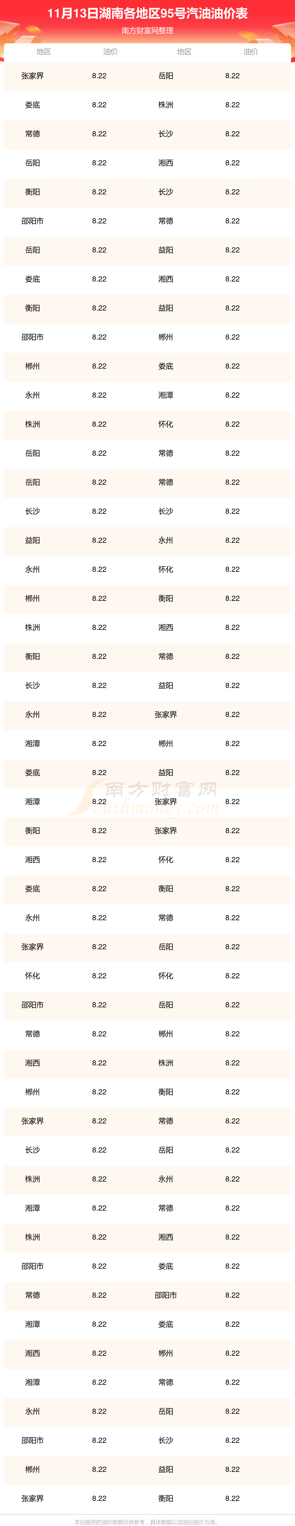 湖南各地區(qū)最新95號汽油油價表