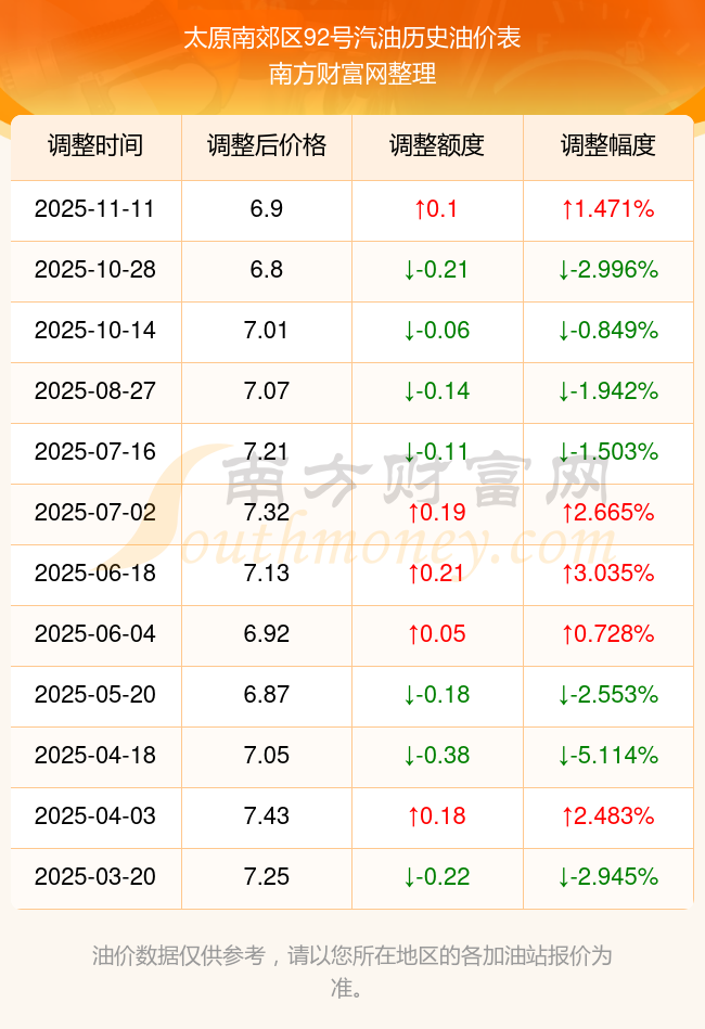 11月13日太原南郊區(qū)92號汽油的價格為6.9元/升,這是11月11日調(diào)整后的價格,相對上次調(diào)整時間10月28日的油價6.8元每升,上升了0.1元,上升幅達(dá)1.471%。