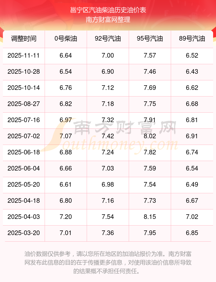 11月13日,邕寧區(qū)汽油、柴油每升最新價格為:92號汽油為7元,上調(diào)了0.1元;95號汽油為7.57元,上調(diào)了0.11元;89號汽油為6.52元,上調(diào)了0.09元;0號柴油為6.64元,上調(diào)了0.1元,調(diào)整時間為11月11日。