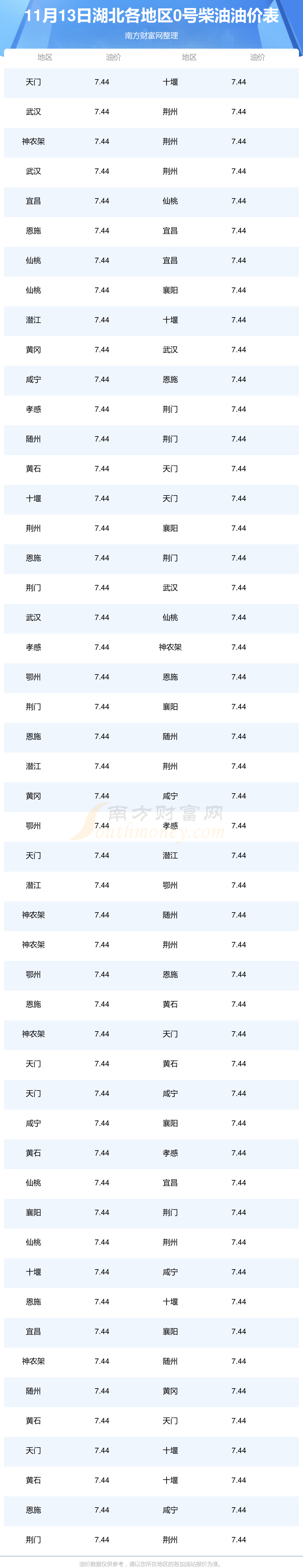 2025年11月13日湖北0號柴油最新價格一覽表