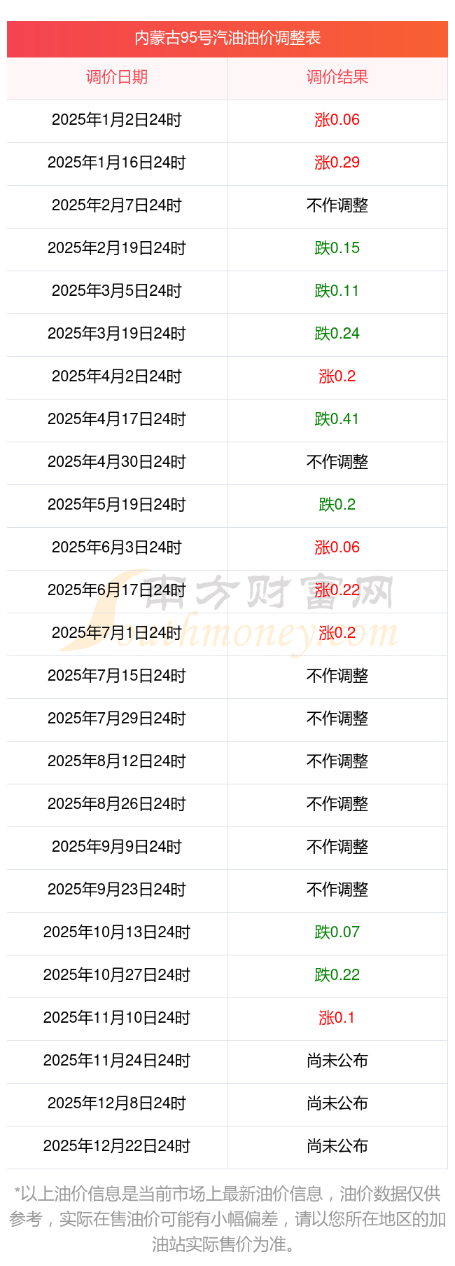 以上數(shù)據(jù)僅供參考,請(qǐng)以您所在地區(qū)的加油站實(shí)際售價(jià)為準(zhǔn)。南方財(cái)富網(wǎng)發(fā)布此信息的目的在于傳播更多信息,對(duì)使用該油價(jià)信息所導(dǎo)致的結(jié)果概不承擔(dān)責(zé)任。