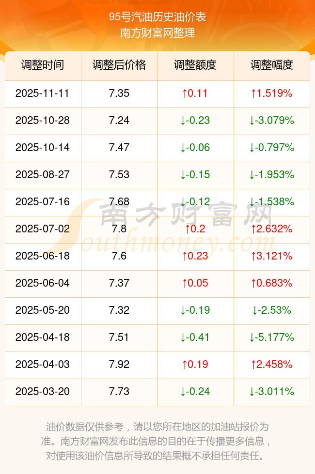 油價調(diào)整最新消息:下一輪油價調(diào)整時間11月24日24時。11月13日上海汽油、柴油的價格為11月11日調(diào)整后的價格。每升最新價格為:92號汽油6.91元,漲了0.1元;95號汽油7.35元,漲了0.11元;89號汽油6.44元,漲了0.09;0號柴油6.56元,漲了0.11元。