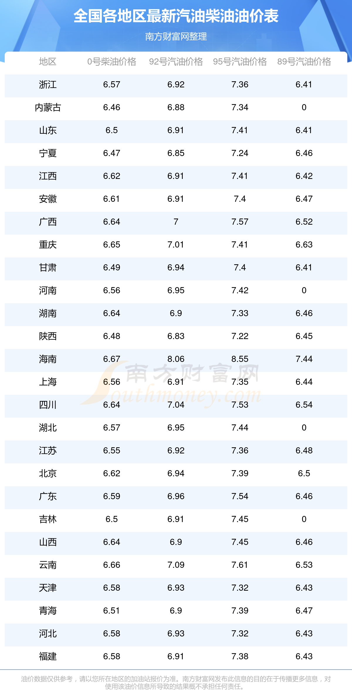 全國0號柴油平均價格為:7元每升,其中,最低為內(nèi)蒙古,價格6.46元/升,最高為海南,價格6.67元/升。