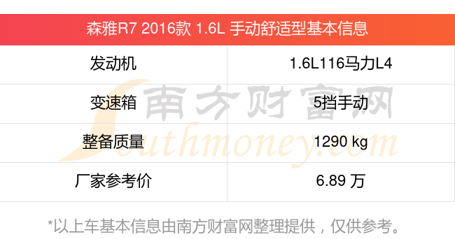 森雅R7 2016款 1.6L 手動舒適型動力上配備的是一臺1.6L116馬力L4自然吸氣發(fā)動機,匹配的是5擋手動擋變速箱,燃料形式為汽油,常規(guī)整備質(zhì)量1290kg,廠家參考價6.89萬元。