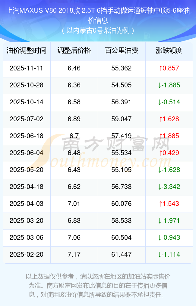 按照11月11日0號(hào)柴油最新調(diào)整價(jià)格6.46元/升來(lái)計(jì)算(以?xún)?nèi)蒙古為例),該車(chē)型百公里平均油費(fèi)為55.362元,按照上一輪10月28日調(diào)整價(jià)格6.36元/升來(lái)計(jì)算,百公里平均油費(fèi)為54.505元,對(duì)比上一輪多花0.857元,下一輪油價(jià)調(diào)整時(shí)間為11月24日24時(shí)。