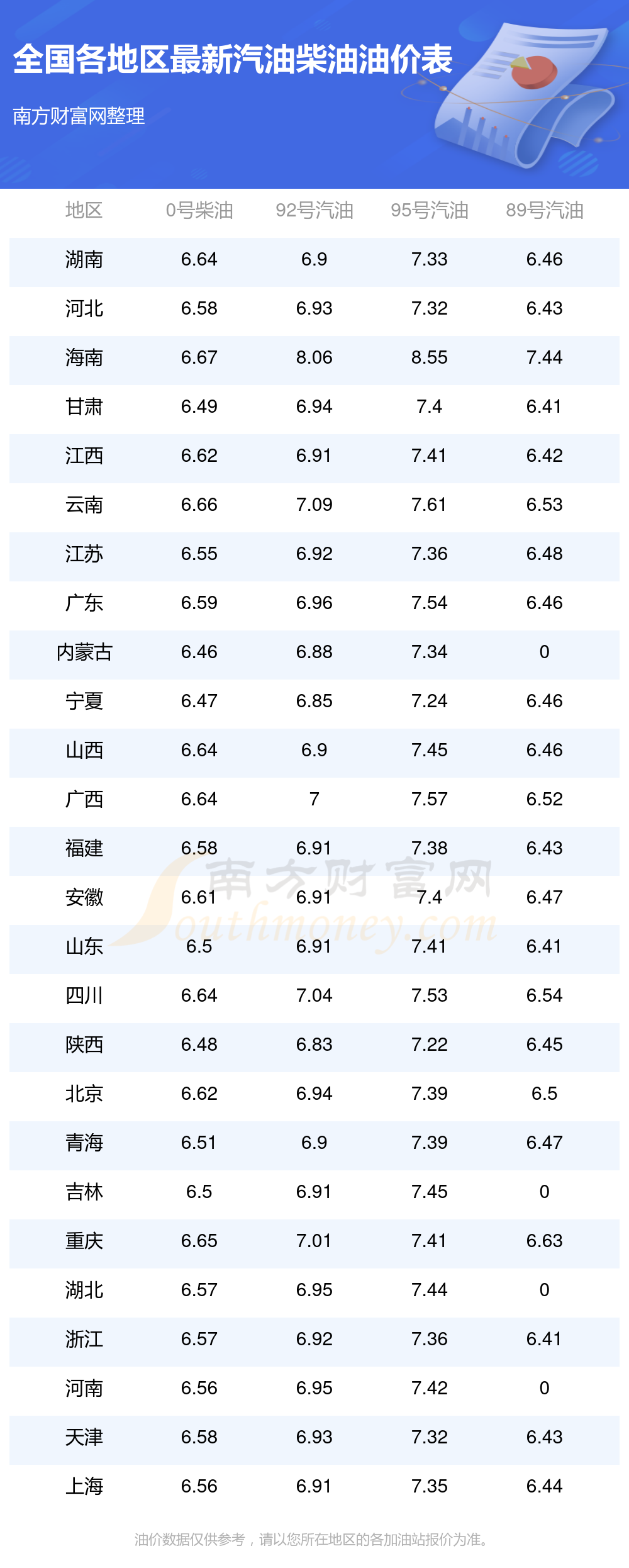 全國各地區(qū)最新油價表