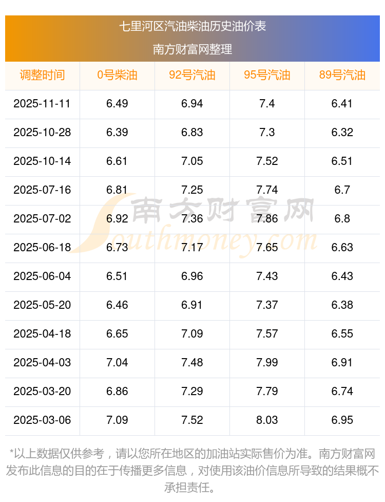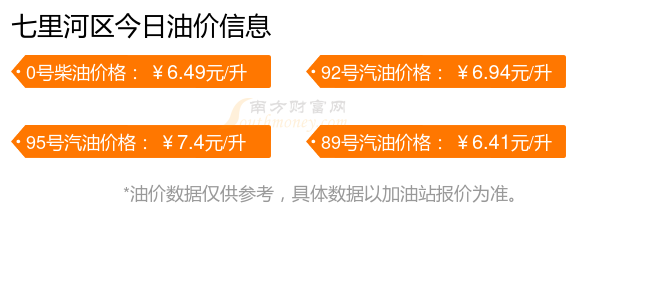 11月13日七里河區(qū)汽油、柴油每升的價格為:92號汽油為6.94元,上調(diào)了0.11元;95號汽油為7.4元,上調(diào)了0.1元;89號汽油為6.41元,上調(diào)了0.09元;0號柴油為6.49元,上調(diào)了0.1元,本輪油價的調(diào)整時間為11月11日。