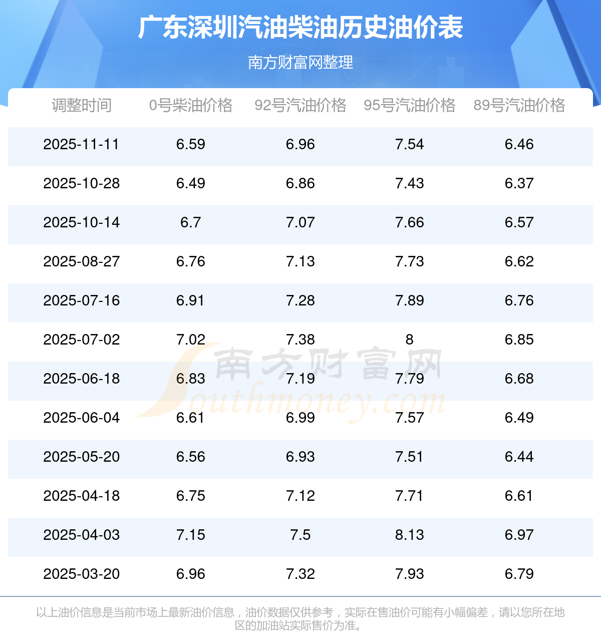 廣東深圳汽油、柴油11月13日每升的價(jià)格為11月11日調(diào)整后的價(jià)格,具體油價(jià)為:92號(hào)汽油6.96元;95號(hào)汽油7.54元;89號(hào)汽油6.46元;0號(hào)柴油6.59元。