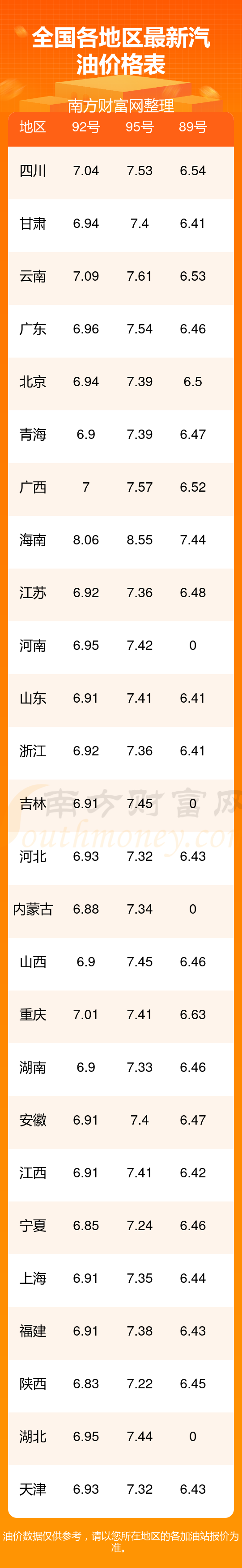 以上油價信息是當(dāng)前市場上最新油價信息,油價數(shù)據(jù)僅供參考,實際在售油價可能有小幅偏差,請以您所在地區(qū)的加油站實際售價為準(zhǔn)。