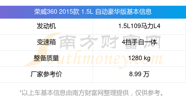 榮威360 2015款 1.5L 自動(dòng)豪華版搭載了一臺(tái)1.5L109馬力L4自然吸氣發(fā)動(dòng)機(jī),采用4擋手自一體自動(dòng)檔變速箱,常規(guī)整備質(zhì)量1280kg,廠家參考價(jià)8.99萬(wàn)元。