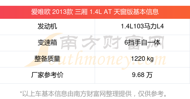 愛(ài)唯歐 2013款 三廂 1.4L AT 天窗版動(dòng)力上搭載的是一臺(tái)1.4L103馬力L4自然吸氣發(fā)動(dòng)機(jī),匹配6擋手自一體自動(dòng)檔變速箱,燃料形式為汽油,常規(guī)整備質(zhì)量1220kg,廠家參考價(jià)9.68萬(wàn)元。
