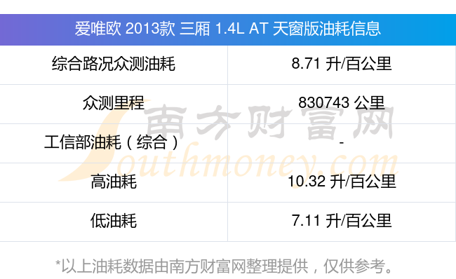 根據(jù)車(chē)主實(shí)測(cè)數(shù)據(jù),該車(chē)型低油耗為7.11L/100km,高油耗為10.32L/100km,綜合路況眾測(cè)油耗為8.71L/100km,工信部綜合油耗為-L/100km。