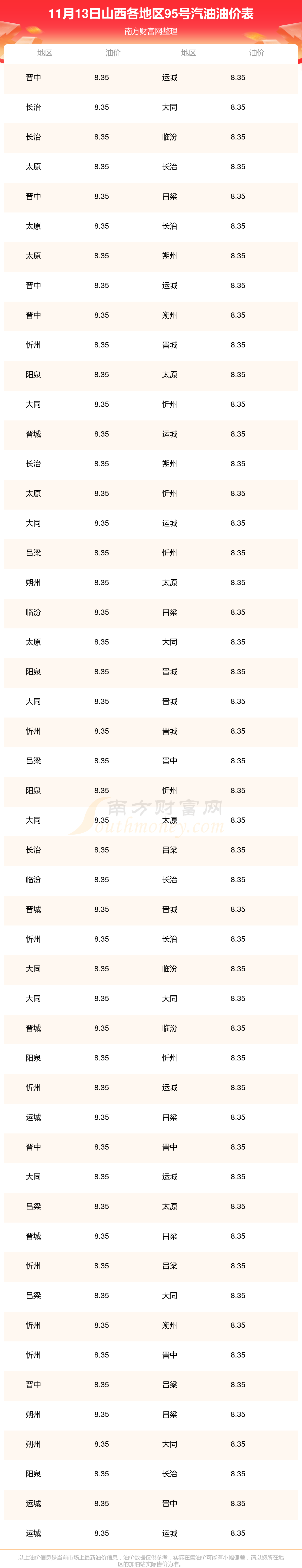 11月13日山西95號汽油的價格是7.45元/升,油價調(diào)整時間是11月11日,對比上一次油價調(diào)整共上漲了0.11元。