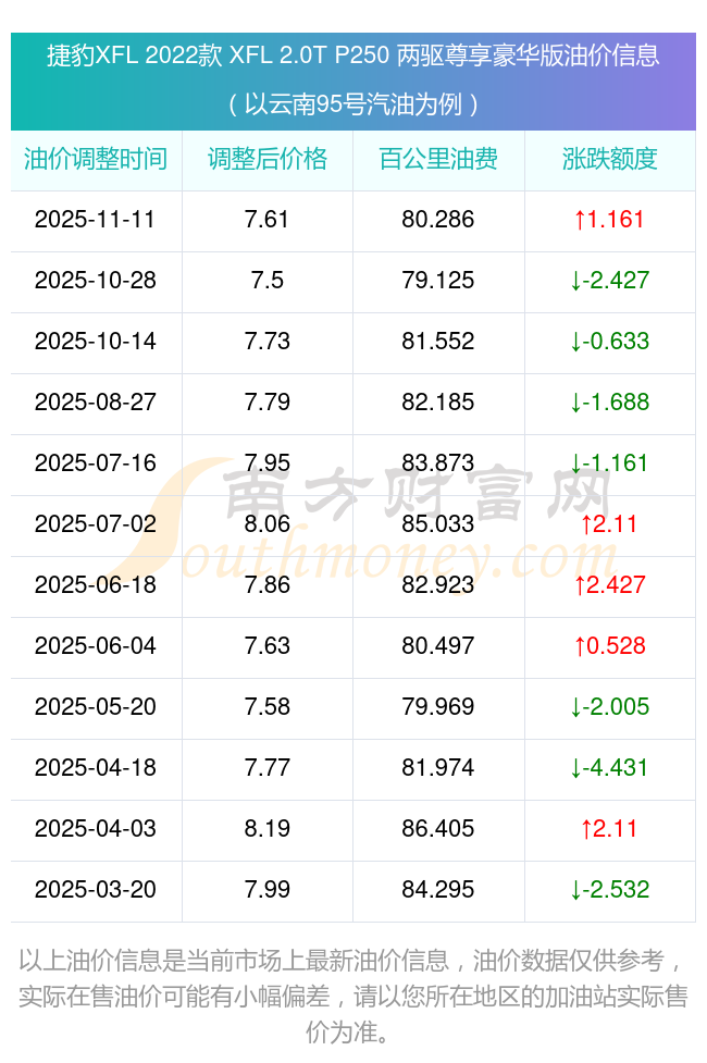 按照11月11日95號(hào)汽油最新調(diào)整價(jià)格7.61元/升來計(jì)算(以云南為例),該車型百公里平均油費(fèi)為80.286元,按照上一輪10月28日調(diào)整價(jià)格7.5元/升來計(jì)算,百公里平均油費(fèi)為79.125元,對(duì)比上一輪多花1.161元,下一輪油價(jià)調(diào)整時(shí)間為11月24日24時(shí)。