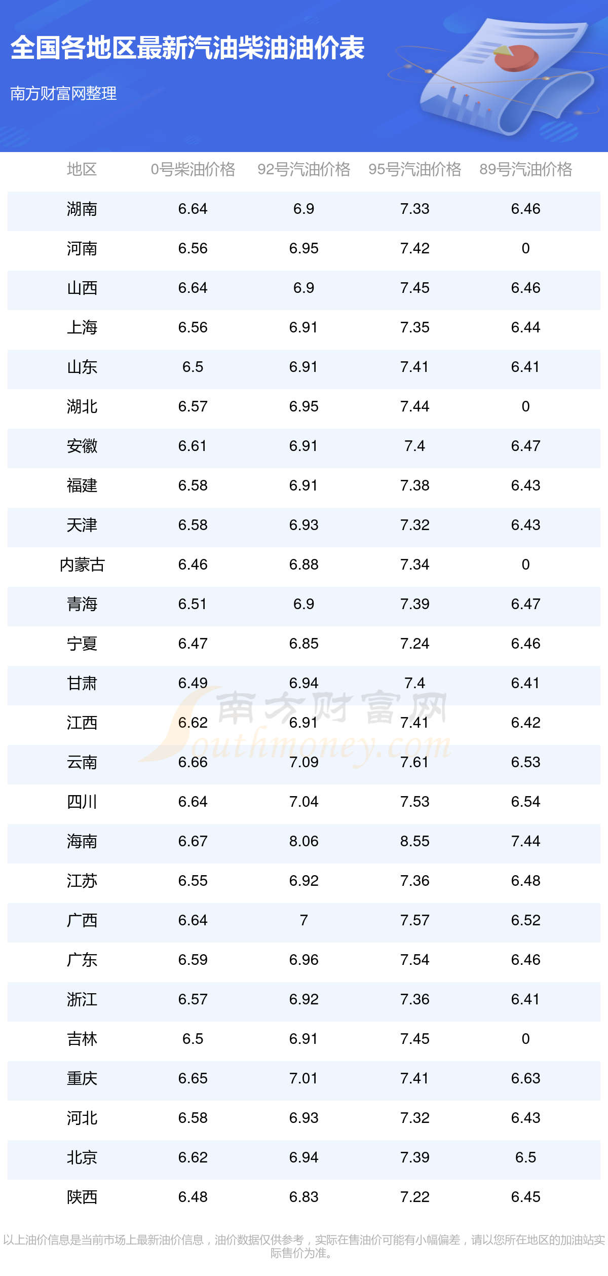 全國89號汽油最新平均價格為:7元每升,其中,最高為海南,價格為7.44元/升,最低為浙江,價格為6.41元/升。