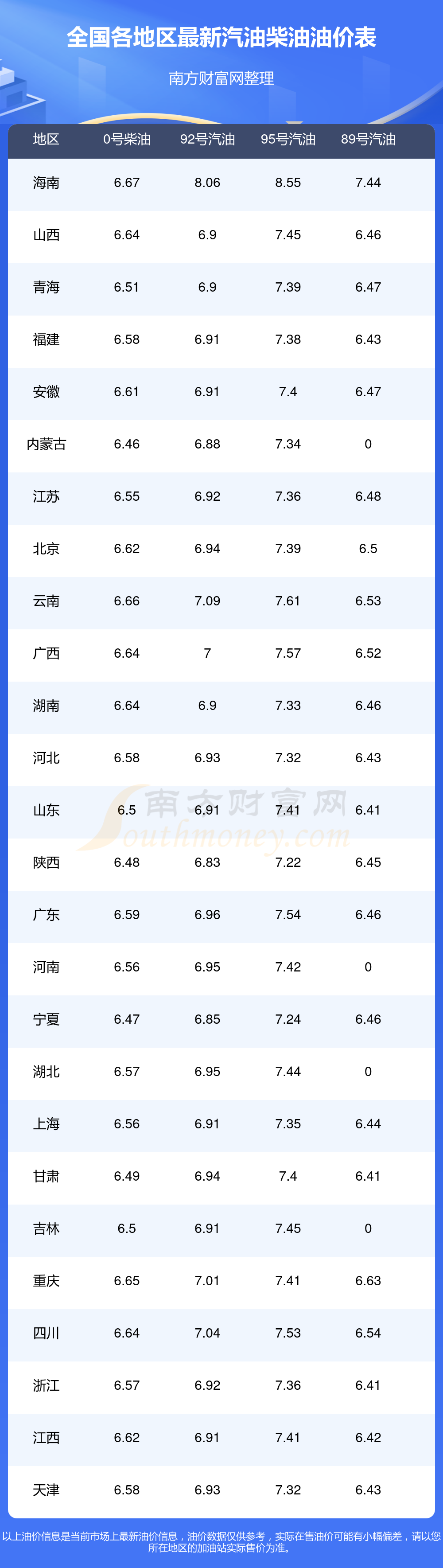 全國0號柴油最新平均價(jià)格為:7元每升,其中,最低為內(nèi)蒙古,價(jià)格為6.46元/升,最高為海南,價(jià)格為6.67元/升。