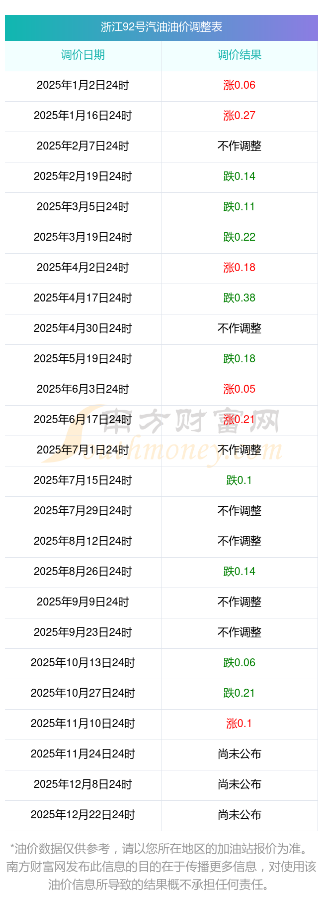 浙江平湖汽油、柴油11月13日每升的價格為:92號汽油6.92元;95號汽油7.36元;89號汽油6.41元;0號柴油6.57元,本次油價調(diào)整時間是11月11日。浙江平湖下一輪油價調(diào)整時間11月24日24時,距離現(xiàn)在還有11.13天。