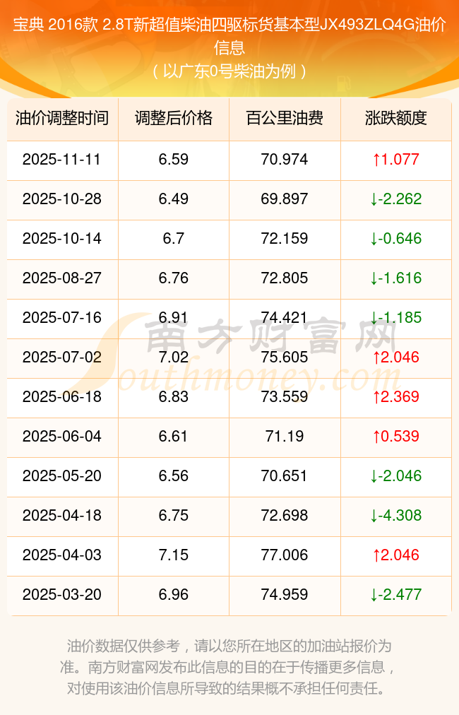 依照11月11日0號柴油最新調(diào)整價格6.59元/升來計算(以廣東為例),該車型百公里的平均油費(fèi)是70.974元,依照上一輪10月28日調(diào)整價格6.49元/升來計算,百公里的平均油費(fèi)是69.897元,對比上一輪多花1.077元,下一輪的油價調(diào)整時間11月24日24時。