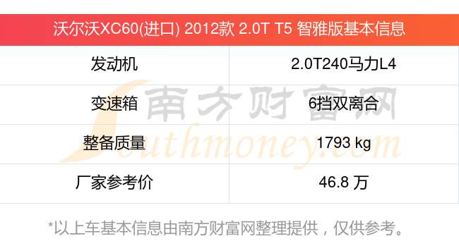 沃爾沃XC60(進(jìn)口) 2012款 2.0T T5 智雅版動(dòng)力上搭載的是一臺(tái)2.0T240馬力L4渦輪增壓發(fā)動(dòng)機(jī),匹配6擋雙離合自動(dòng)檔變速箱,燃料形式為汽油,常規(guī)整備質(zhì)量1793kg,廠家參考價(jià)46.8萬元。
