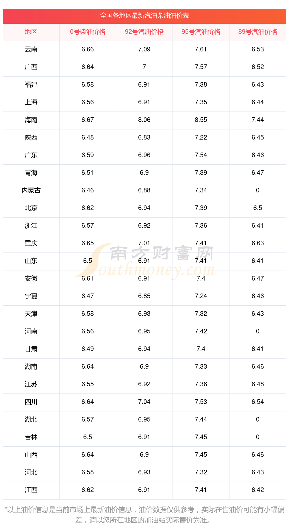 油價調(diào)整最新消息:下一輪汽油價格調(diào)整時間11月24日24時。本輪油價的調(diào)整時間為11月11日,調(diào)整后全國92號汽油平均價格為7元每升,其中,最低為陜西的6.83元/升,最高為海南的8.06元/升。全國95號汽油平均價格為7元每升,其中,最低為陜西的7.22元/升,最高為海南的8.55元/升。全國0號柴油平均價格為:7元每升,其中,最低為內(nèi)蒙古的6.46元/升,最高為海南的6.67元/升。全國89號汽油平均價格為7元每升,其中,最低為浙江的6.41元/升,最高為海南的7.44元/升。