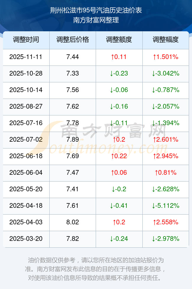 11月14日荊州松滋市95號汽油歷史油價(jià)調(diào)整一覽表