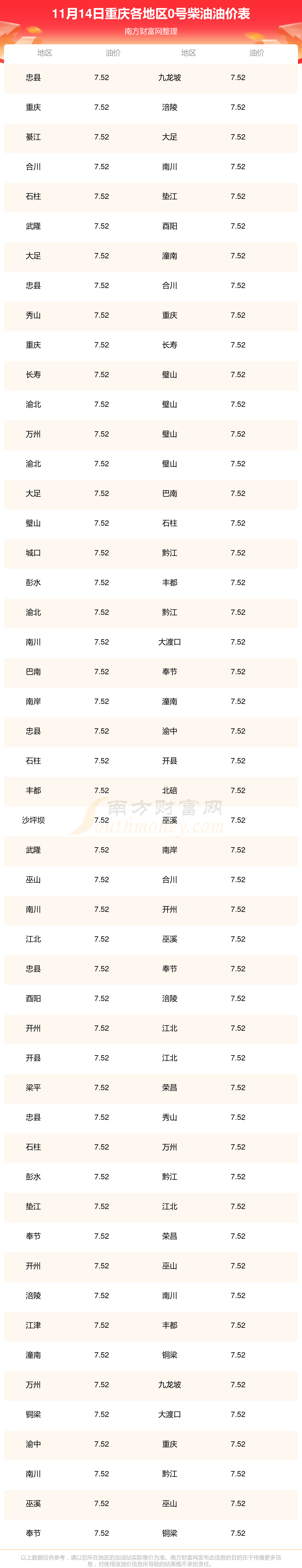 11月14日重慶0號柴油的價格是11月11日調(diào)整后的價格,具體是6.65元/升,本輪重慶0號柴油油價增了0.1元。
