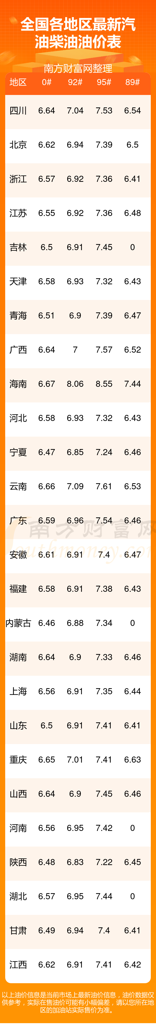 油價(jià)數(shù)據(jù)僅供參考,請(qǐng)以您所在地區(qū)的加油站報(bào)價(jià)為準(zhǔn)。南方財(cái)富網(wǎng)發(fā)布此信息的目的在于傳播更多信息,對(duì)使用該油價(jià)信息所導(dǎo)致的結(jié)果概不承擔(dān)任何責(zé)任。