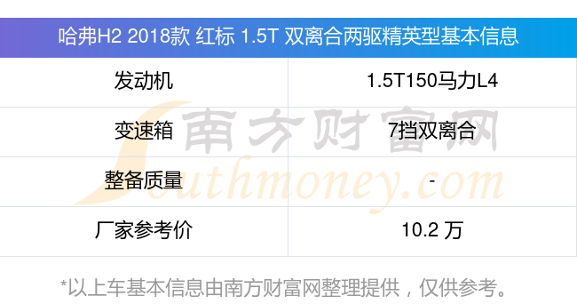 哈弗H2 2018款 紅標(biāo) 1.5T 雙離合兩驅(qū)精英型動力上配備的是一臺1.5T150馬力L4渦輪增壓發(fā)動機(jī),匹配的是7擋雙離合自動檔變速箱,燃料形式為汽油,廠家參考價10.2萬元。