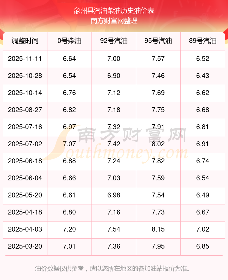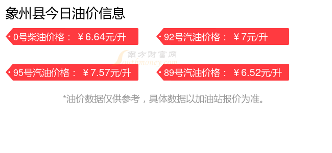 11月15日象州縣汽油每升的價(jià)格為11月11日調(diào)整后的價(jià)格,具體價(jià)格如下:92號汽油7元;95號汽油7.57元;89號汽油6.52元;0號柴油6.64元。