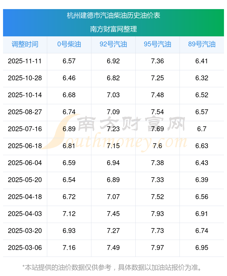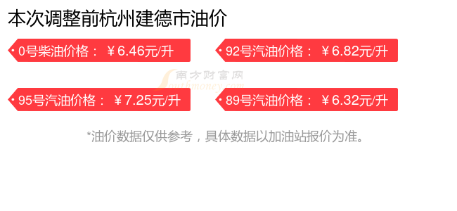杭州建德市汽油、柴油11月15日每升最新價格為:92號汽油為6.92元;95號汽油為7.36元;89號汽油為6.41元;0號柴油為6.57元,調(diào)整時間為11月11日。