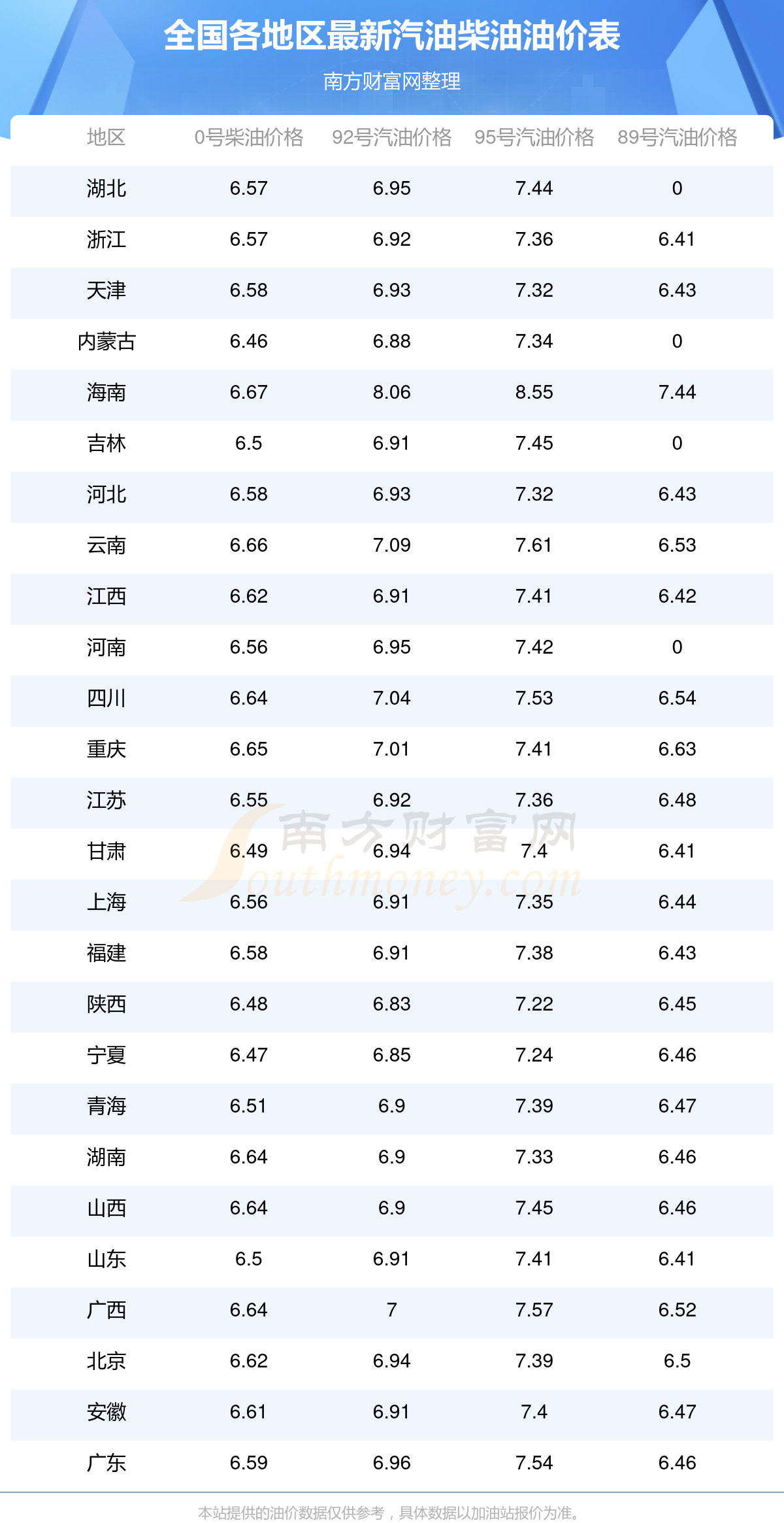 全國各地區(qū)2025年最新汽油價格表