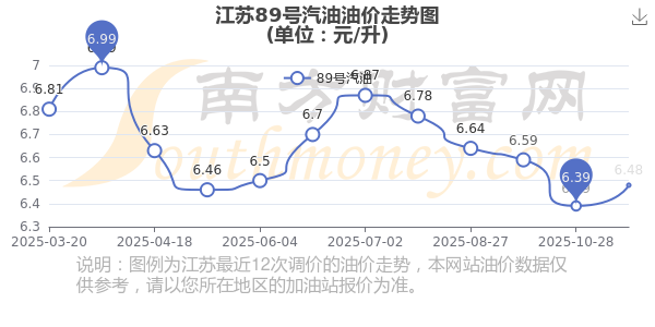 11月15日江蘇89號(hào)汽油價(jià)格為6.48元/升,調(diào)整時(shí)間為11月11日,相對上次調(diào)整時(shí)間10月28日的油價(jià)6.39元/升,增了0.09元。