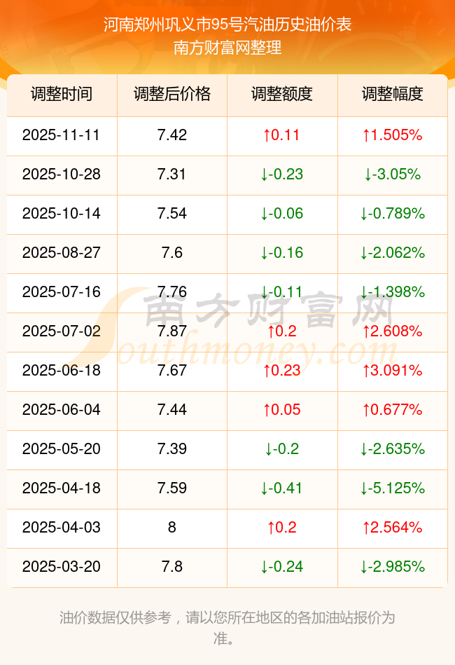 河南鄭州鞏義市95號(hào)汽油歷史油價(jià)表