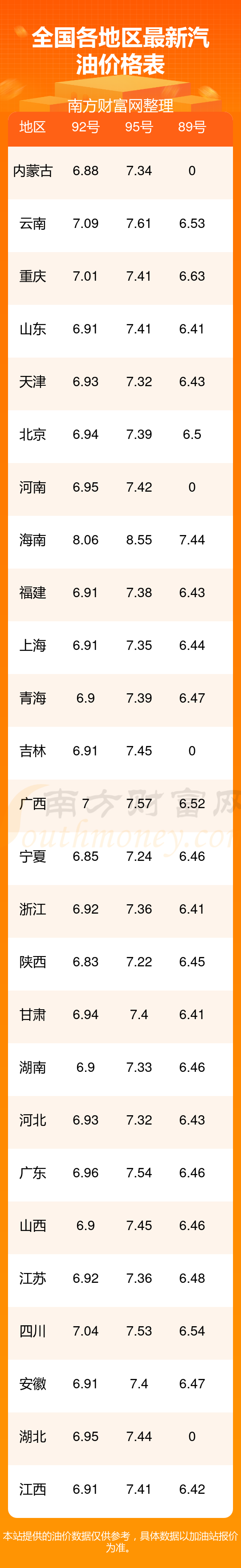 以上數(shù)據(jù)僅供參考,請(qǐng)以您所在地區(qū)的加油站實(shí)際售價(jià)為準(zhǔn)。南方財(cái)富網(wǎng)發(fā)布此信息的目的在于傳播更多信息,對(duì)使用該油價(jià)信息所導(dǎo)致的結(jié)果概不承擔(dān)責(zé)任。