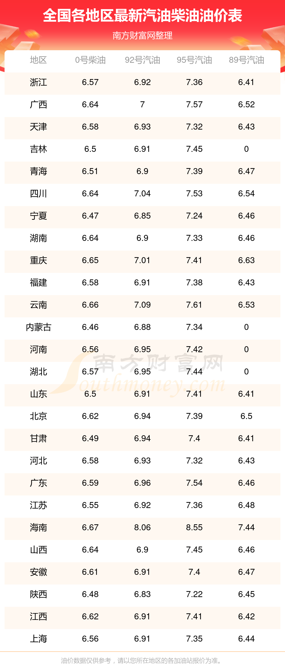 全國(guó)各地區(qū)最新汽油價(jià)格表