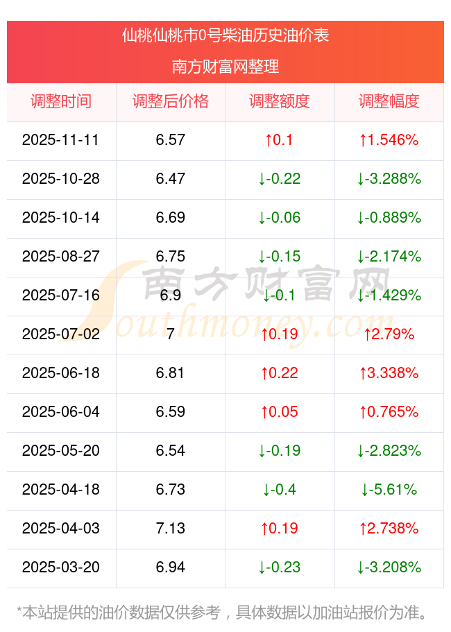 11月15日仙桃仙桃市0號柴油歷史油價一覽表