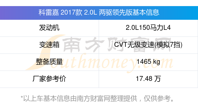 科雷嘉 2017款 2.0L 兩驅(qū)領(lǐng)先版動力上配備的是一臺2.0L150馬力L4自然吸氣發(fā)動機,匹配的是CVT無級變速(模擬7擋)自動檔變速箱,燃料形式為汽油,常規(guī)整備質(zhì)量1465kg,廠家參考價17.48萬元。