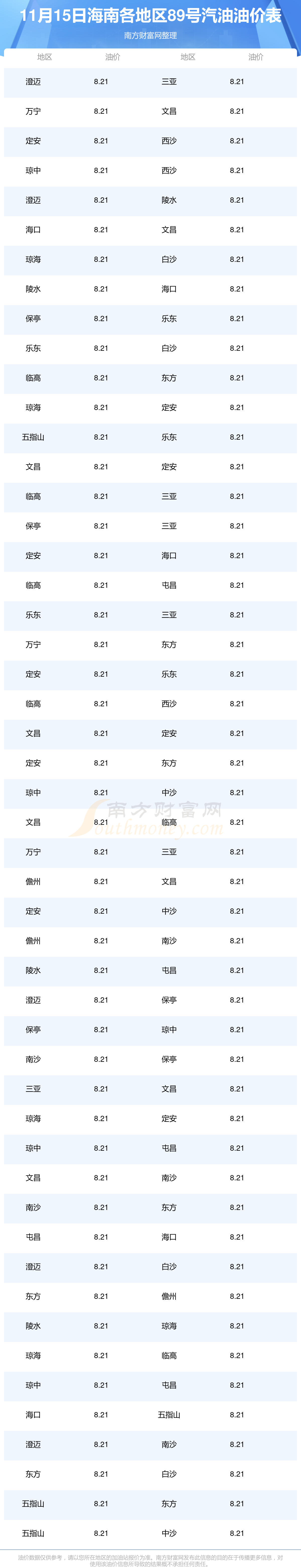 海南各地區(qū)最新89號(hào)汽油油價(jià)表