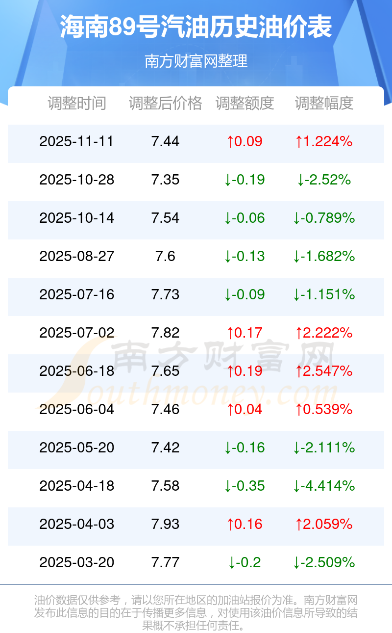 海南89號(hào)汽油11月15日價(jià)格為7.44元/升,調(diào)整時(shí)間為11月11日,相對(duì)上次調(diào)整上漲了0.09元,上漲1.224%。