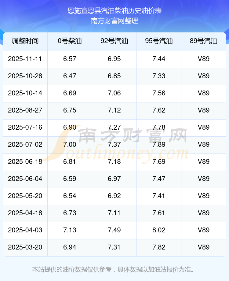以上數(shù)據(jù)僅供參考,請以您所在地區(qū)的加油站實(shí)際售價為準(zhǔn)。南方財富網(wǎng)發(fā)布此信息的目的在于傳播更多信息,對使用該油價信息所導(dǎo)致的結(jié)果概不承擔(dān)責(zé)任。