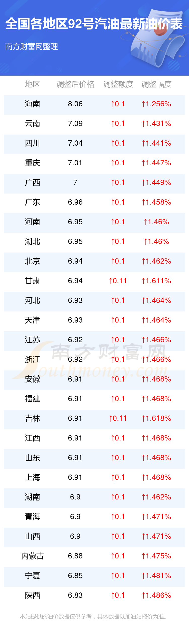 全國92號汽油11月15日的價格多少錢一升?11月11日油價調(diào)整后,詳情如下:平均價格為7元/升,最低的是陜西,價格6.83元/升,最高的是海南,價格8.06元/升。