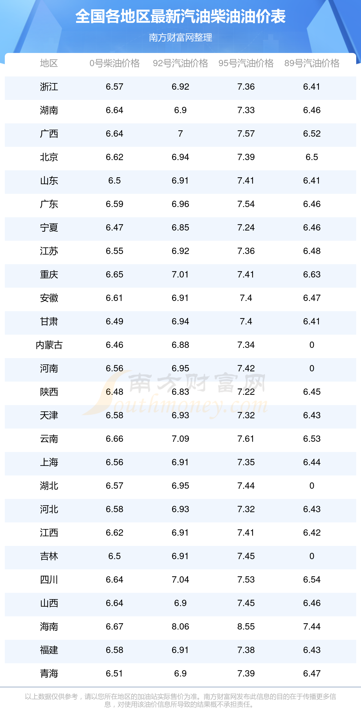 這一輪油價調(diào)整的時間是11月11日,調(diào)整后全國油價的具體價格為:92號汽油平均價格為7元每升,其中,最低的是陜西,6.83元每升,最高的是海南,8.06元每升。95號汽油平均價格為7元每升,其中,最低的是陜西,7.22元每升,最高的是海南,8.55元每升。0號柴油平均價格為:7元每升,其中,最低的是內(nèi)蒙古,6.46元每升,最高的是海南,6.67元每升。89號汽油平均價格為7元每升,其中,最低的是浙江,6.41元每升,最高的是海南,7.44元每升。