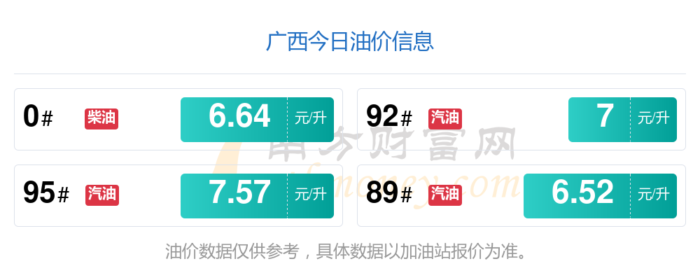 汽油價格調(diào)整最新消息:下一輪油價調(diào)整時間11月24日24時。廣西汽油、柴油11月15日每升最新價格查詢:本輪油價調(diào)整時間為11月11日,92號汽油7元,上調(diào)了0.1元;95號汽油7.57元,上調(diào)了0.11元;89號汽油6.52元,上調(diào)了0.09;0號柴油6.64元,上調(diào)了0.1元。