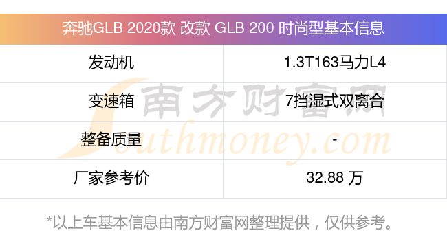 奔馳GLB 2020款 改款 GLB 200 時(shí)尚型動(dòng)力上配備的是一臺(tái)1.3T163馬力L4渦輪增壓發(fā)動(dòng)機(jī),匹配的是7擋濕式雙離合自動(dòng)檔變速箱,燃料形式為汽油,廠家參考價(jià)32.88萬(wàn)元。