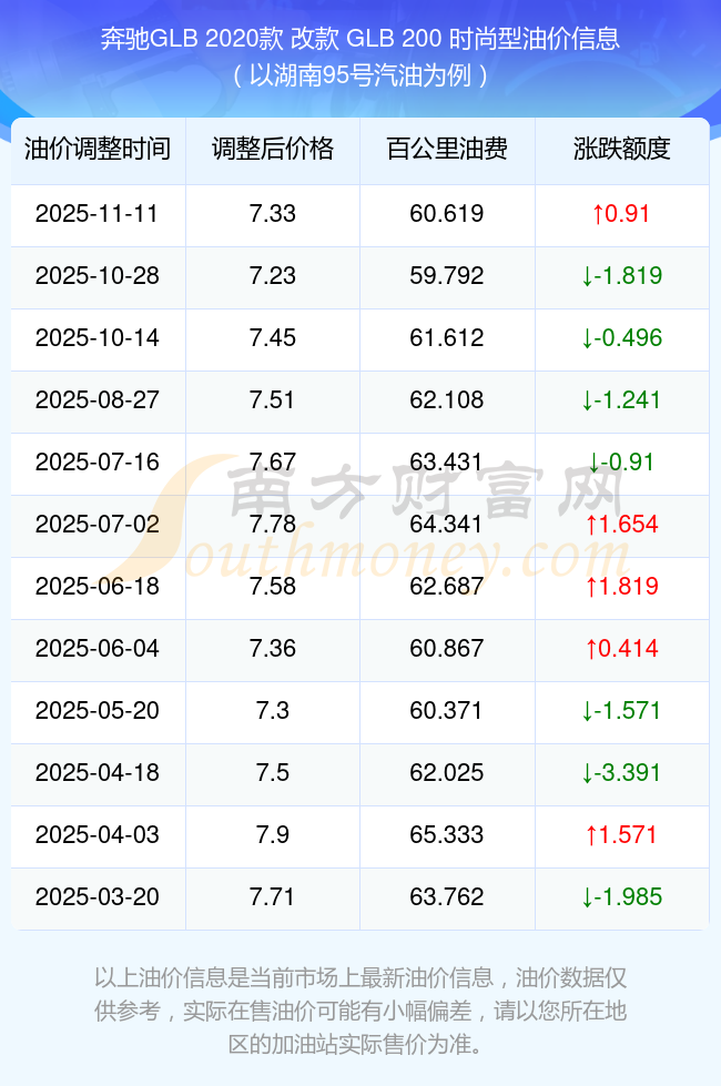依照11月11日95號(hào)汽油最新調(diào)整價(jià)格7.33元/升來(lái)計(jì)算(以湖南為例),該車型百公里的平均油費(fèi)是60.619元,依照上一輪10月28日調(diào)整價(jià)格7.23元/升來(lái)計(jì)算,百公里的平均油費(fèi)是59.792元,對(duì)比上一輪多花0.91元,下一輪的油價(jià)調(diào)整時(shí)間11月24日24時(shí)。