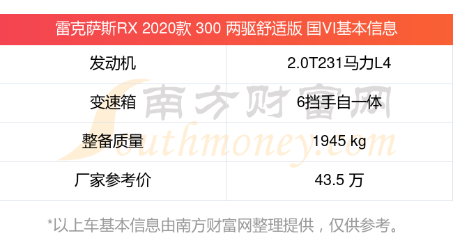 雷克薩斯RX 2020款 300 兩驅(qū)舒適版 國VI動力上搭載的是一臺2.0T231馬力L4渦輪增壓發(fā)動機,匹配6擋手自一體自動檔變速箱,燃料形式為汽油,常規(guī)整備質(zhì)量1945kg,廠家參考價43.5萬元。