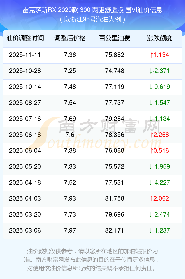 根據(jù)11月11日95號汽油最新調(diào)整價格7.36元/升來計算(以浙江為例),該車型每百公里的平均油費是75.882元,上一輪10月28日調(diào)整價格7.25元每升來計算,每百公里的平均油費是74.748元,對比上一輪多花1.134元,下一輪的油價調(diào)整時間是11月24日24時。