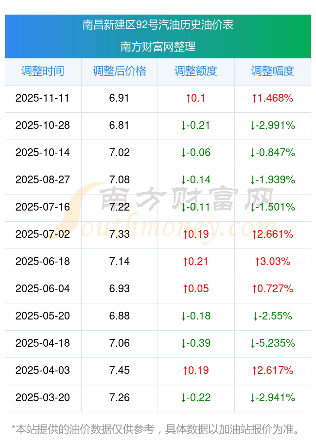 南昌新建區(qū)92號汽油歷史油價表
