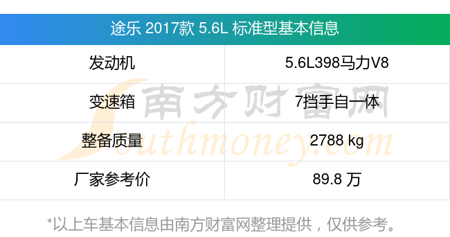 途樂(lè) 2017款 5.6L 標(biāo)準(zhǔn)型動(dòng)力上配備的是一臺(tái)5.6L398馬力V8自然吸氣發(fā)動(dòng)機(jī),匹配的是7擋手自一體自動(dòng)檔變速箱,燃料形式為汽油,常規(guī)整備質(zhì)量2788kg,廠家參考價(jià)89.8萬(wàn)元。